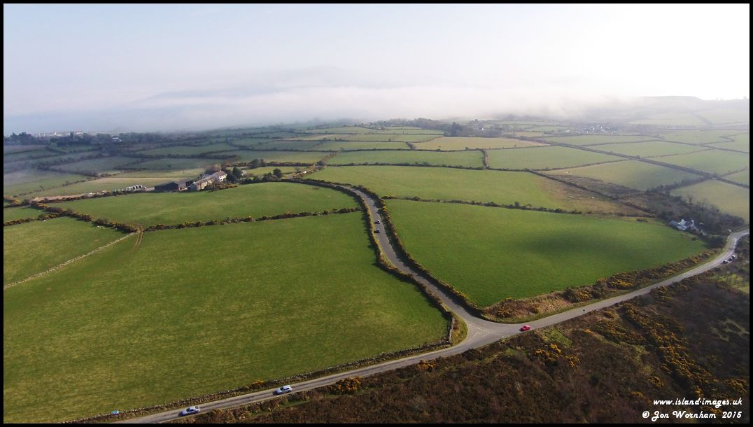 Sea fog over Douglas, pictured from overhead Axnfell Plantation