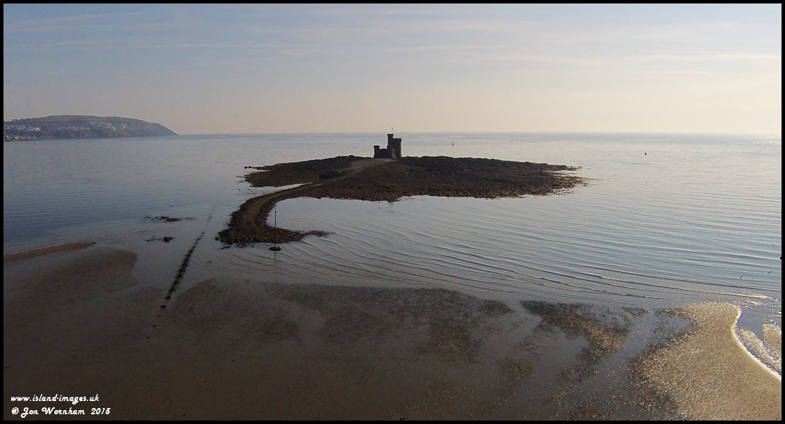 The Tower of Refuge on Conister Rock, pictured at a low tide with the causeway to the beach uncovered.