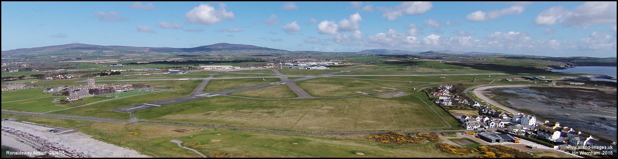 A panoramic vew of Ronaldsway Airport from overhead the beach just to the south of the airport.