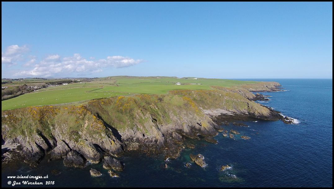 Looking north from overhead the Port Grenaugh inlet, towards Santon Head