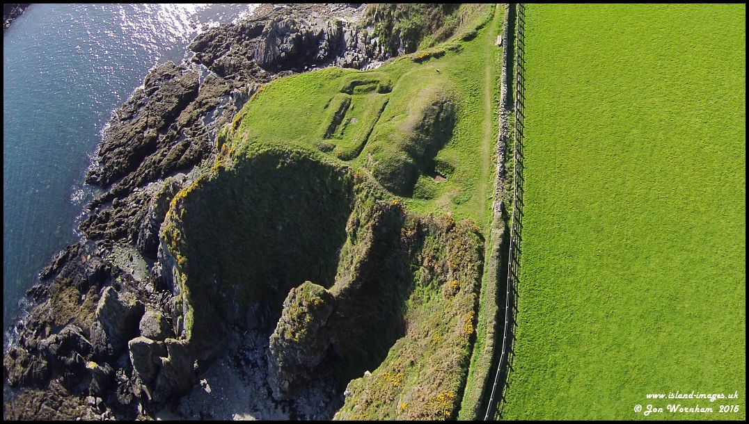 Near vertical view of the Bronze Age promontory fort at Port Grenaugh. The original defensive earth mound and ditch can be seen, together with the outline of a later Viking period house