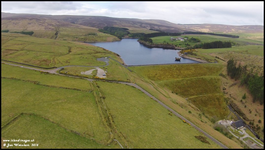 Sulby Reservoir, showing the large dam to hold the waters back from Sulby Glen