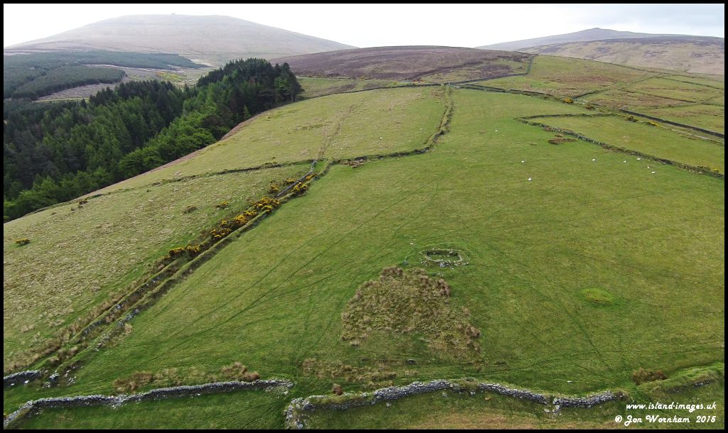 Showing the site of the ancient Keeill and burial ground, Snaefell in the distance
