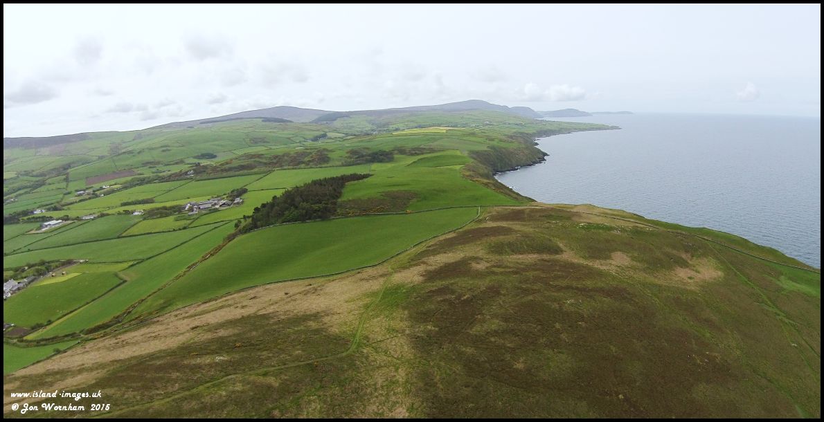 From overhead Peel Hill looking to the south past Knockaloe Farm