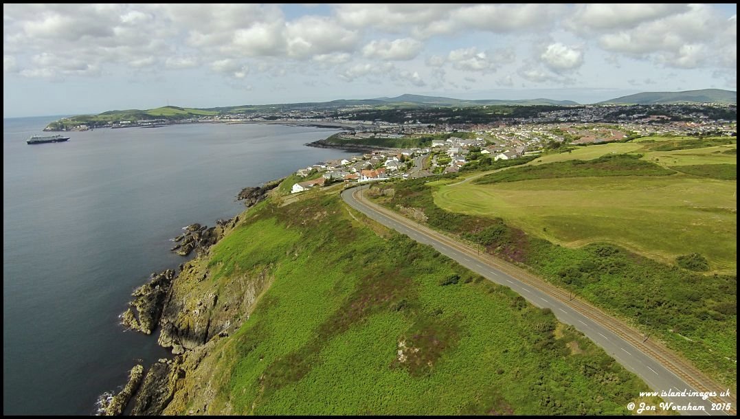 View to the south from Howstrake to Onchan and Douglas, with a cruise ship in the bay