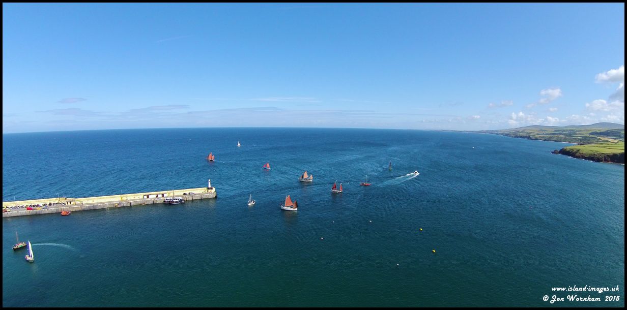 Boats from the Peel Traditional Boat festival rounding the breakwater
