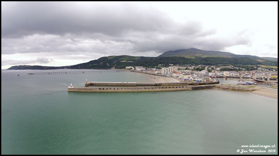 Just airborne from Ramsey north beach and looking south past the harbour entrance to Maughold Head