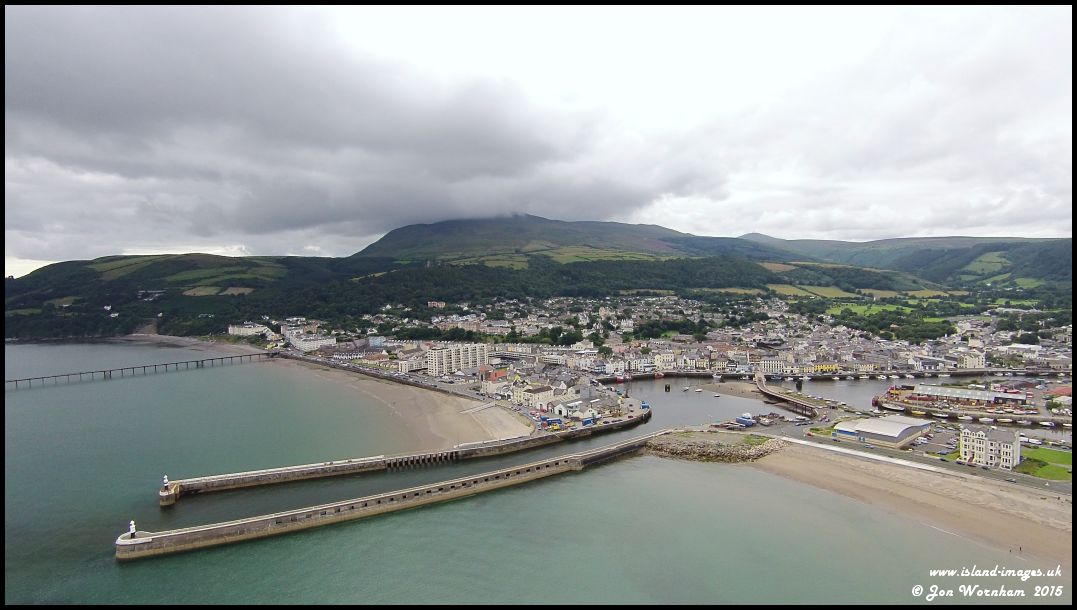 Ramsey harbour and piers, with cloud topping North Barrule