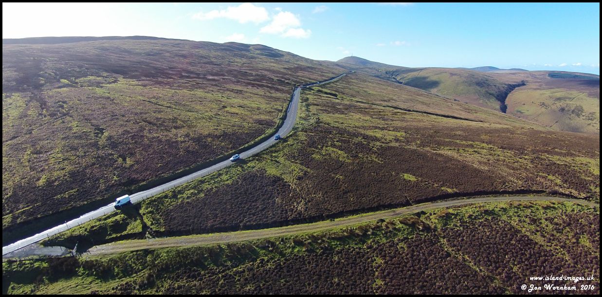 Looking from Guthrie's Memorial south along the Mountain Road. Snaefell in the distance.