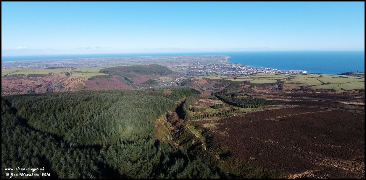Aerial view from Guthrie's Memorial down to Ramsey, with the Point of Ayre in the distance.