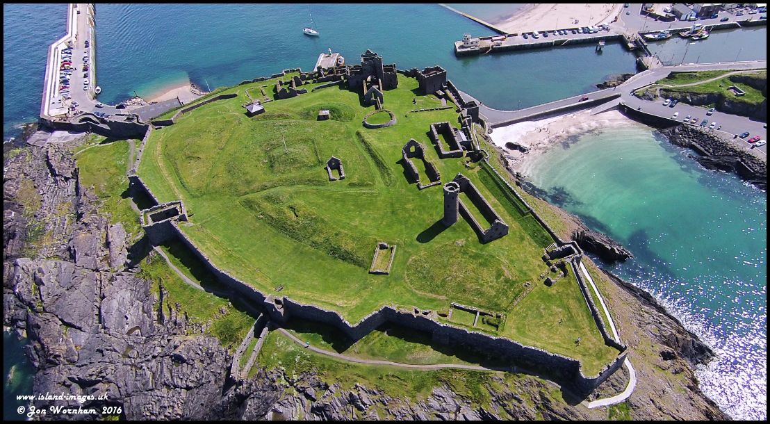 A near vertical view of the castle. The building at top centre of the picture was the original Cathedral of St German, constructed in the 12th Century, falling into disrepair in the 18th Century.