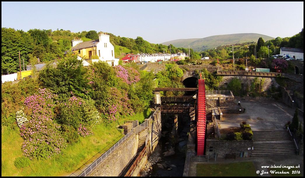 End on veiw of the Lady Evelyn, with the Laxey River running alongside