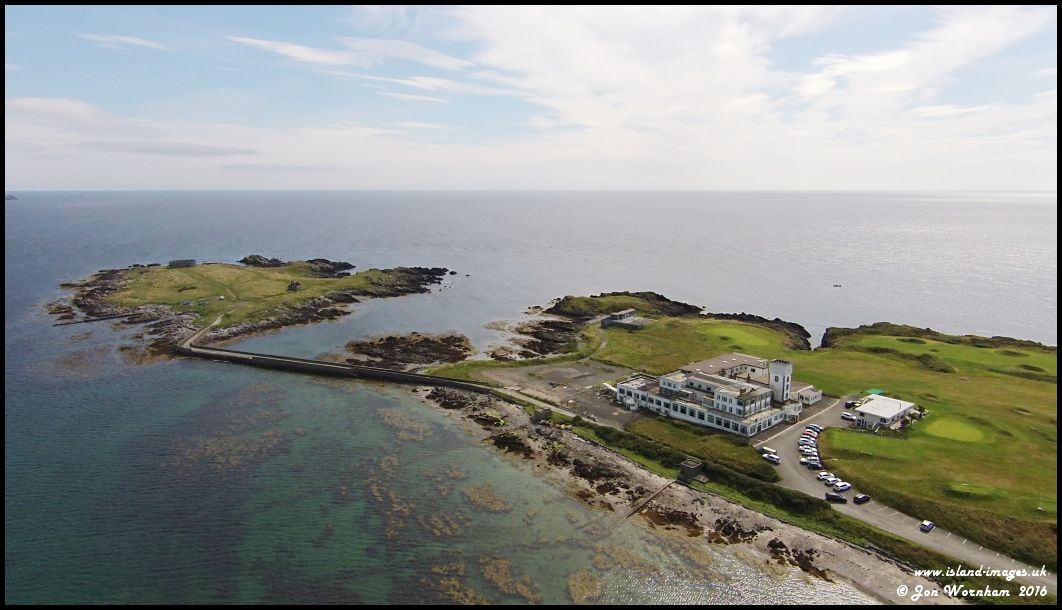 Pulling back from the previous shot to include the former Golf Links Hotel and Golf Links clubhouse adjacent to St Michael's Isle