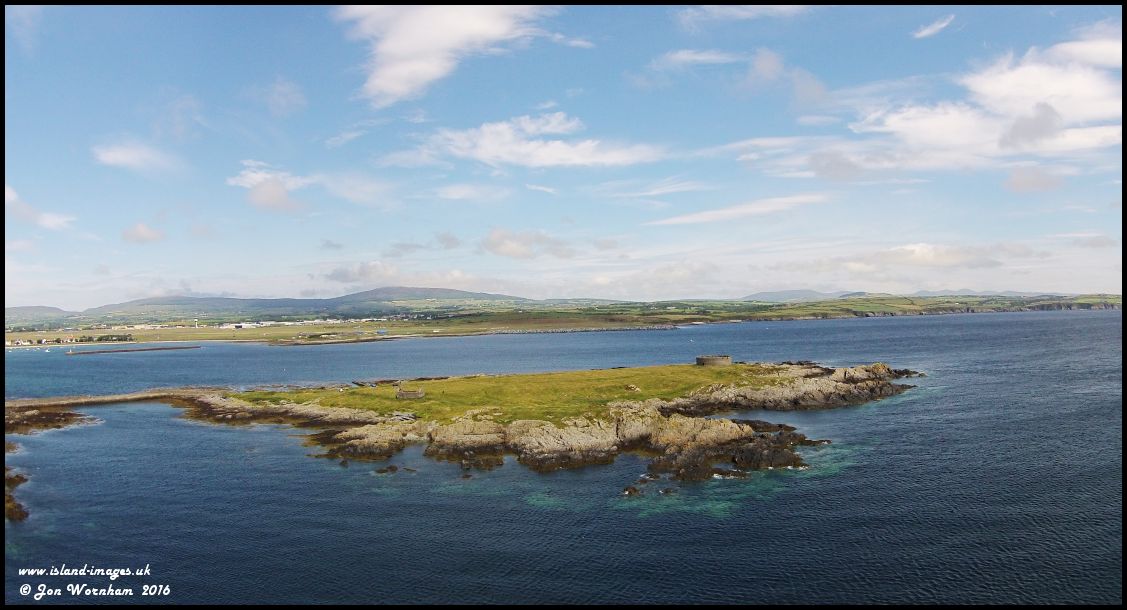 St Michael's Isle from the south with Ronaldsway Airport behind, highlighting the need for co-ordination with Air Traffic Control before flying.