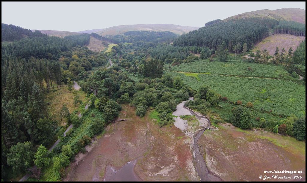 An old bridge, normally under water, can just be seen towards the centre of this picture, showing the original course of the river through the valley before the reservoir was constructed.