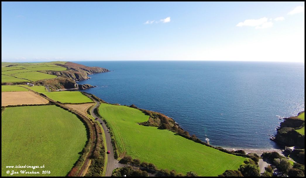 View from above Port Soderick, looking back to Keristal. The Isle of Man Railway tracks briefly follow the Marine Drive at this point before curving away to Port Soderick Station