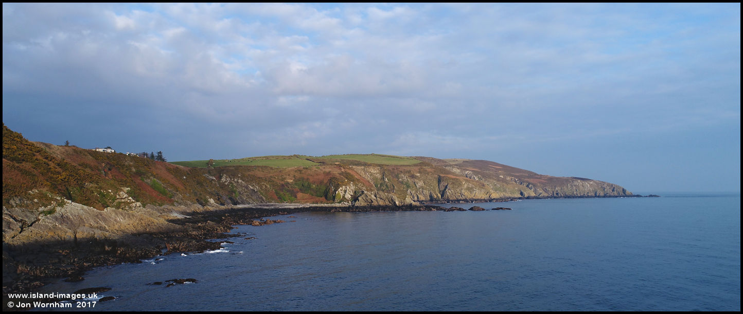 Coastline view from offshore at Port Soderick, looking past Keristal to Little Ness
