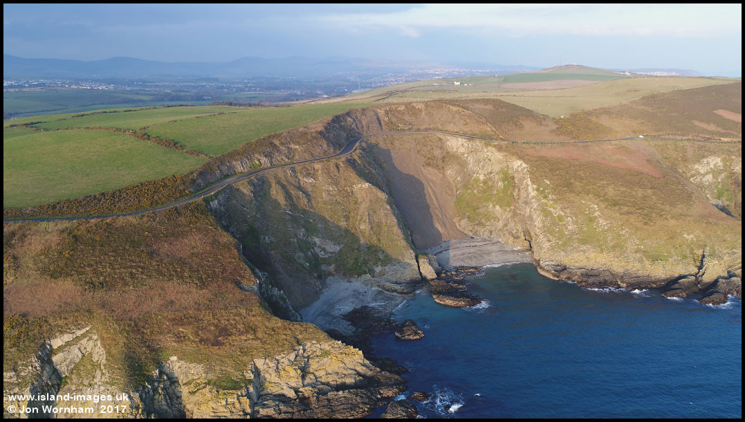 The Marine Drive clinging rather precariously to the clifftops high above the sea by The Whing. The Douglas Southern Electric tramway used to run along it from Douglas to Port Soderick.