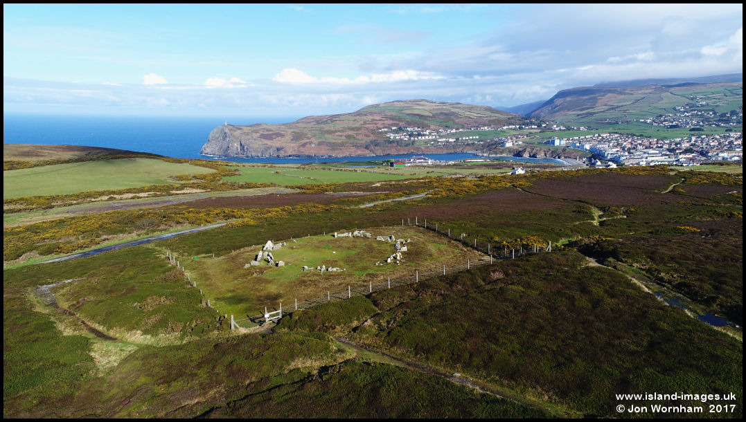 View across the stone circle to Bradda Head