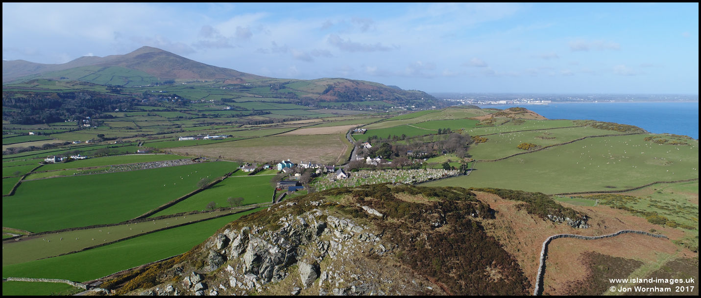The summit of Maughold Head at over 300ft above sea level. North Barrule and Ramsey in the distance