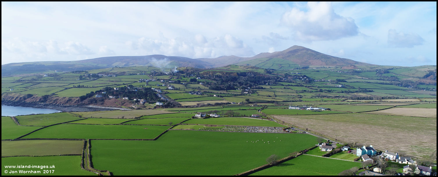 Looking south over the Maughold parish fields to Port Mooar and the mountains