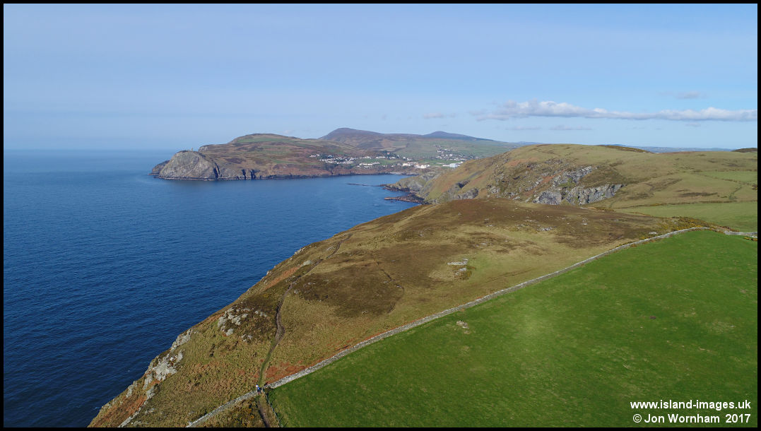 Climbing to a higher altitude for a view along the coast footpath towards Port Erin. An interesting colour change between the farmed field and rough grass and heather along the coast.