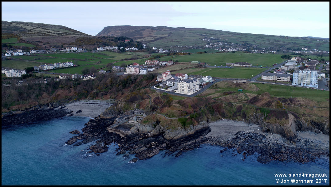 Spaldrick and Traie Vane beaches, with the remains of the old sea water swimming pool between them