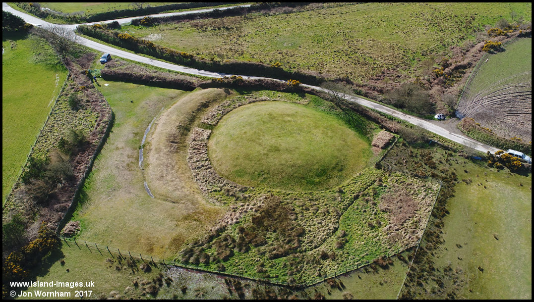A near vertical view of the Broogh Fort, showing the raised centre 'dome' and defensive ditches and banks surrounding it.