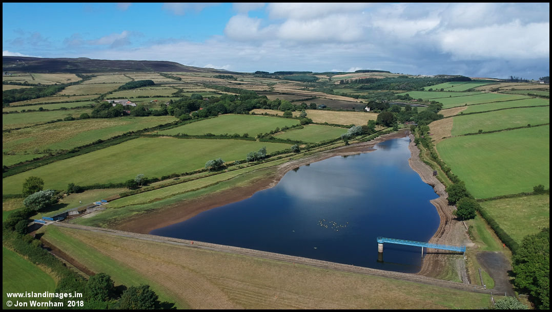 Looking across Kerrowdhoo Reservoir towards Honey Hill, with low water levels after a period of no rain. Some recent rains have turned the grass green again but not significantly replenished the reservoir.