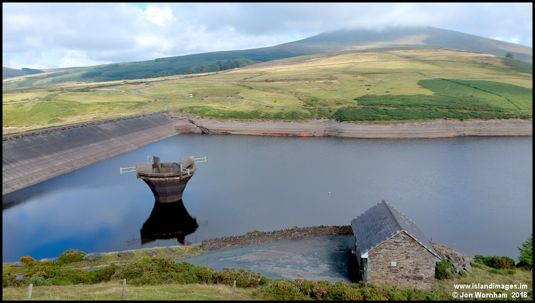 A lower level view across the reservoir to a cloud capped Snaefell.