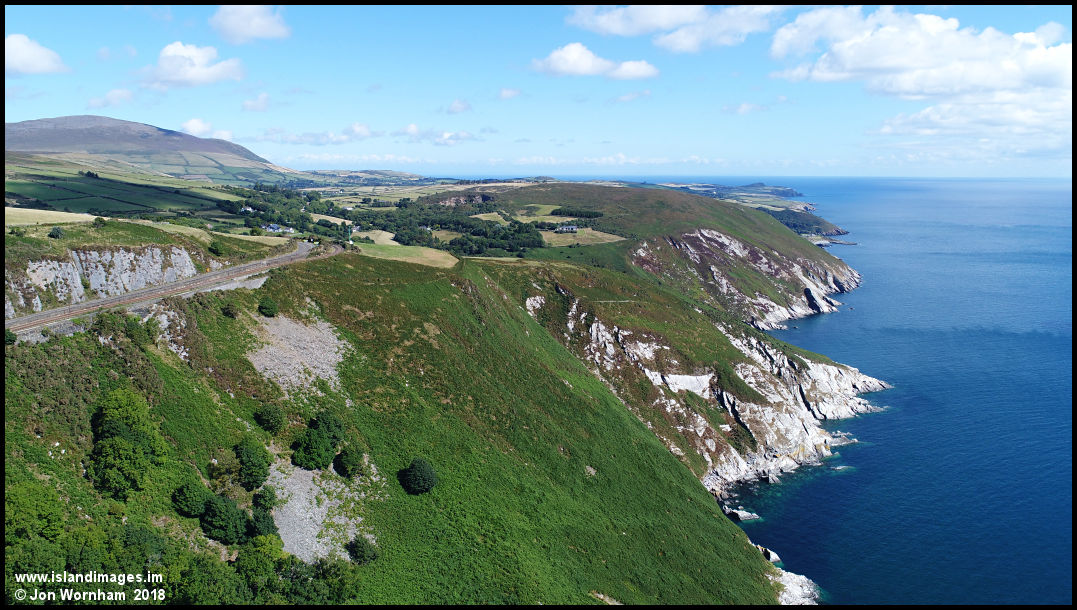 The headland at the north of Bulgham Bay, where road and railway curve tightly around before dropping down to cross the Dhoon Glen