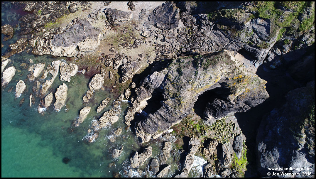 A vertical view of rocks at the southern end of Lhiannag, which include a natural arch.