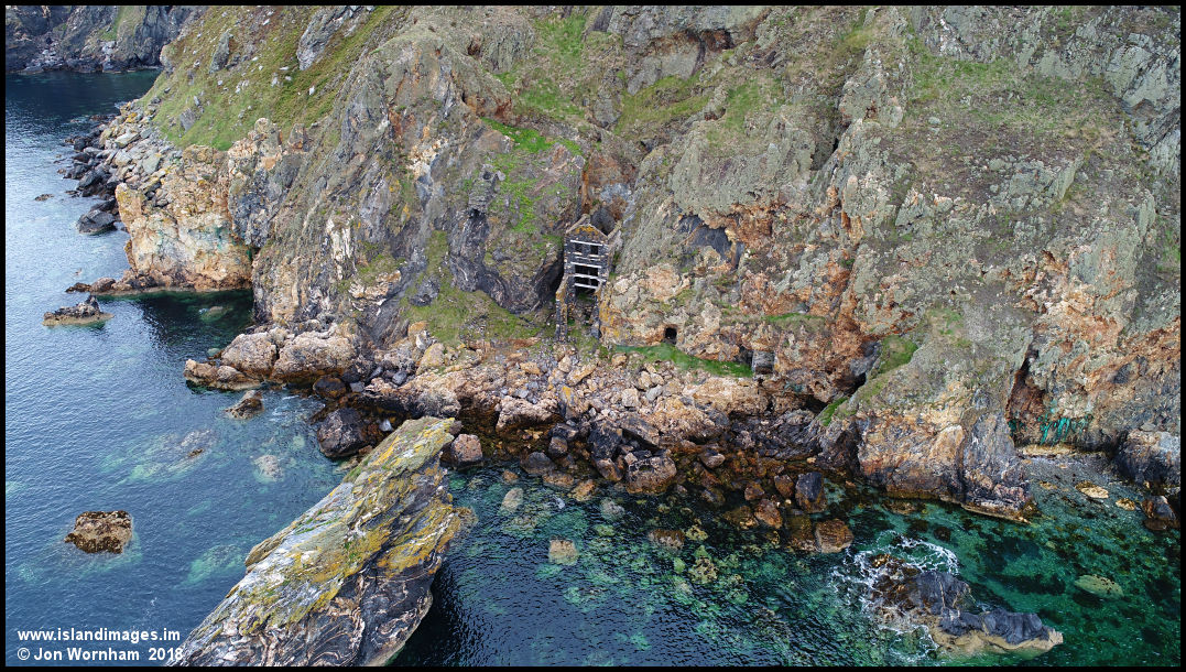 Moving the drone around the 'Creg Harlot' rock for a different angle. Note the green stains on the rocks from copper deposits, this and lead was the main product of the mine.