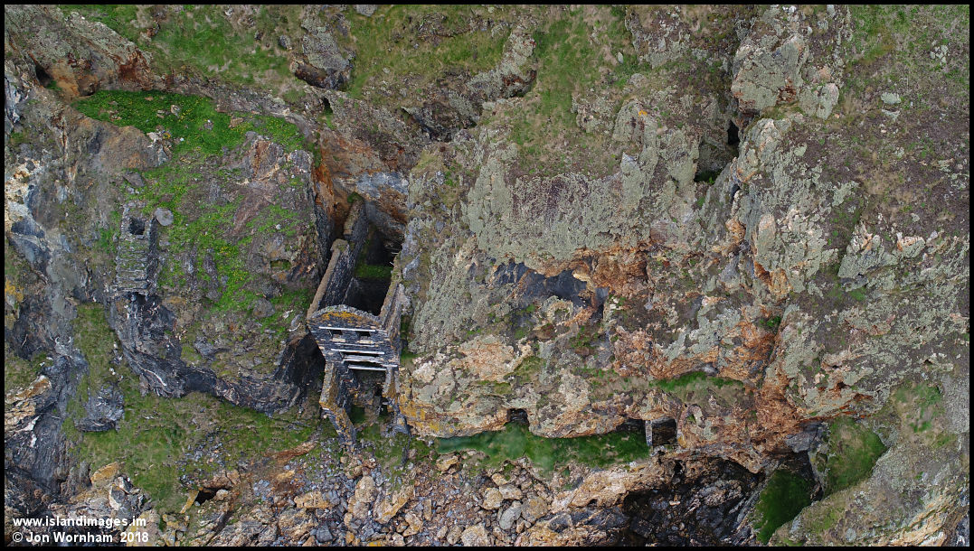 Moving in quite close to the cliffs for a look into the engine house. There appears to be the remains of a chimney to the left, built onto the rock. Various opening into the rock suggest the remains of addits.