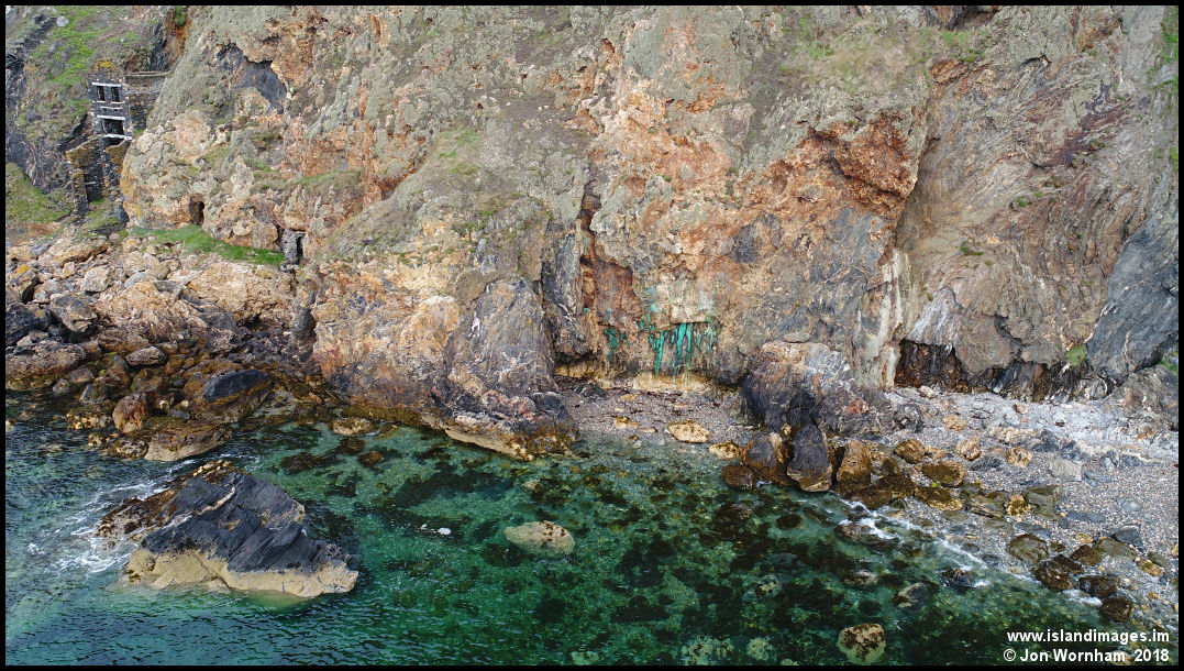 Bright green copper stains in the rocks just above beach level.