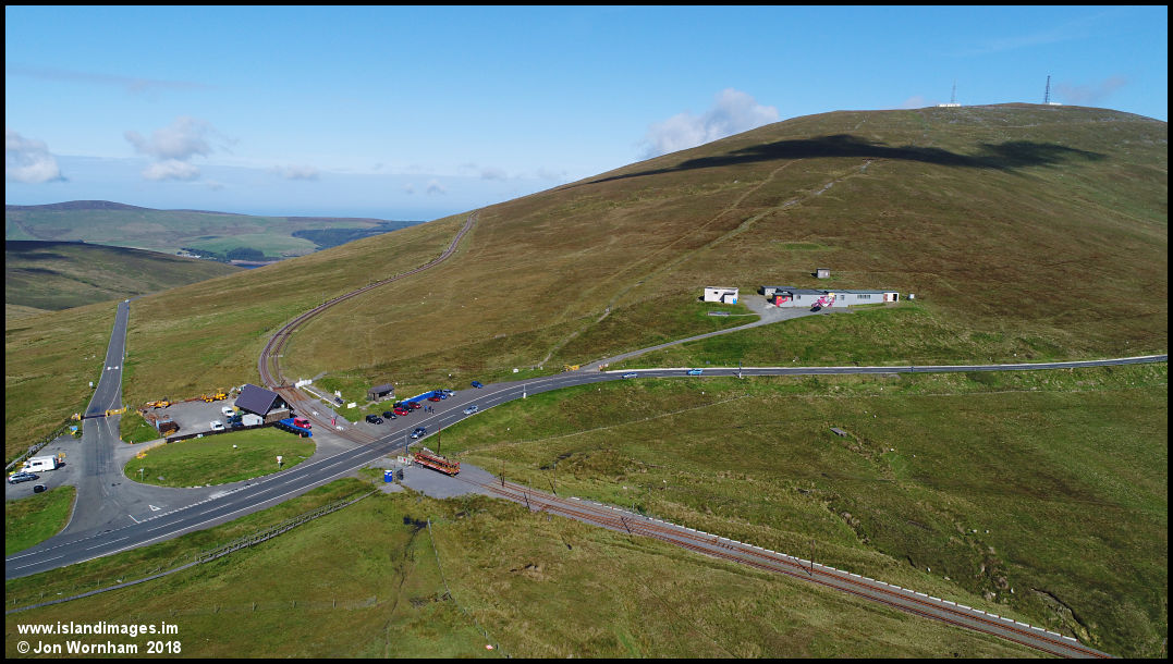 A lower level view of The Bungalow and Snaefell, with a tram heading down to Laxey.
