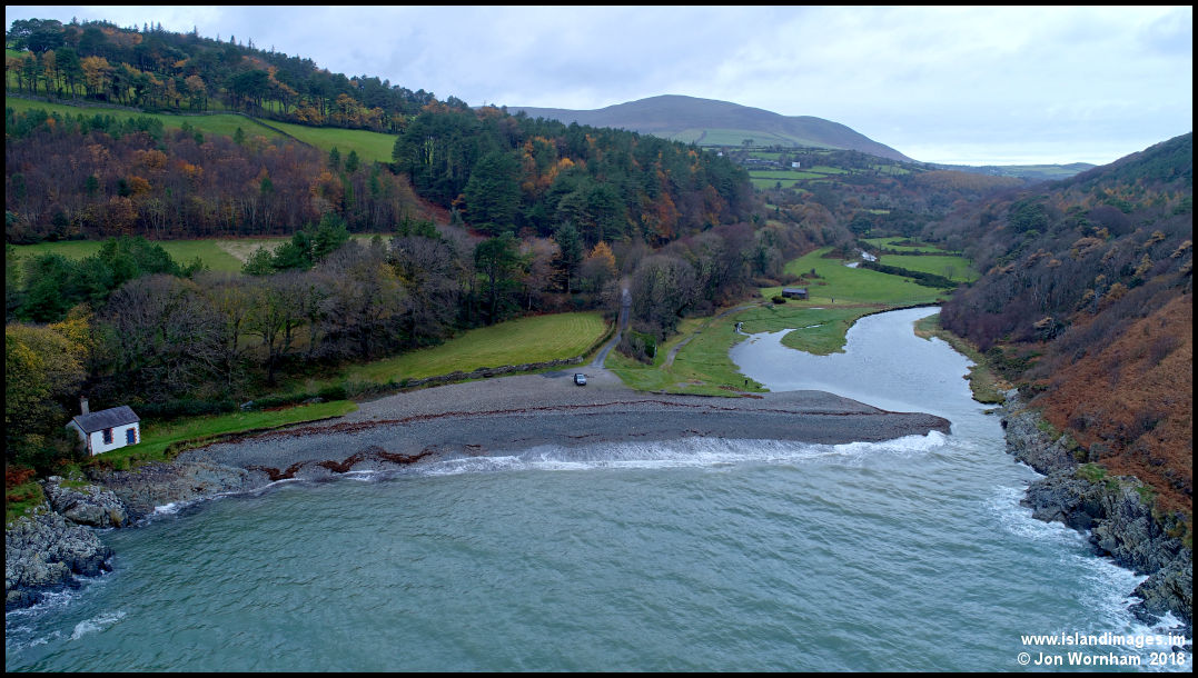 Looking inland from over the sea at Port Cornaa.