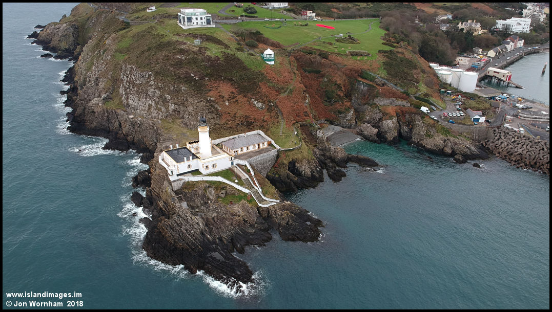 A more vertical view of the lighthouse, with the Camera Obsura perched on the cliff above.