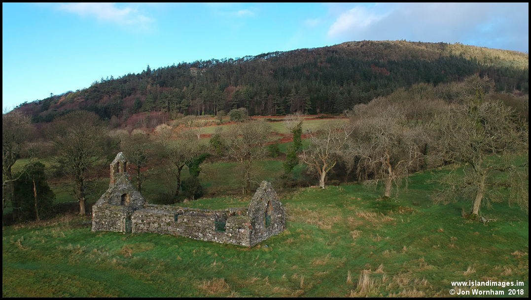 The roofless St Trinian's, with Greeba, home of the fearsome Buggane, rising behind.