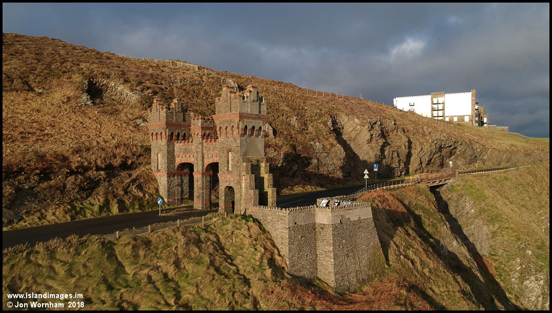 The impressive Marine Drive Archway viewed from over the sea. Consructed in the 1880s it originally incorporated a toll collector's house where the viewing platform now stands.