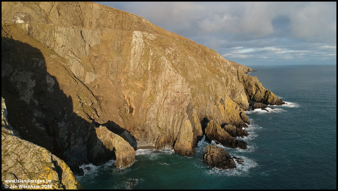Port Wallberry, with the Marine Drive cut into the cliffs. The Douglas Southern Electric Tramway used to cross the inlet on a narrow viaduct, the remains of which still lie on the beach.
