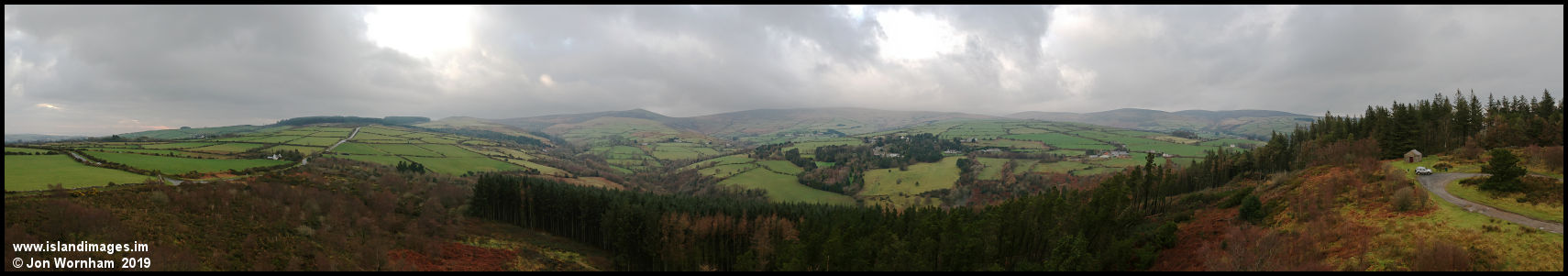 Panorama from Axnfell looking over Glen Roy under a falling cloud base with rain threatening.