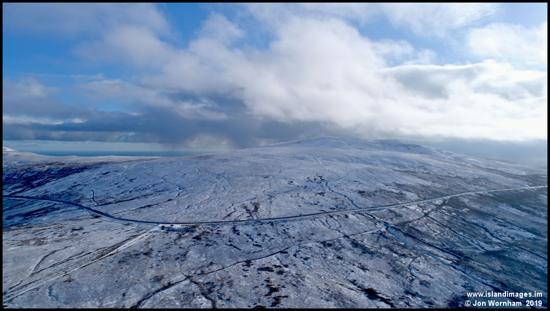 Final view from the Mountain Box location, showing the Mountain Road curving around the slopes of Clagh Ouyr with cloud brushing its summit.
