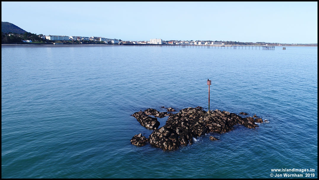 The Carrick Rock with sky reflections now making the sea more blue. Ramsey as backdrop.