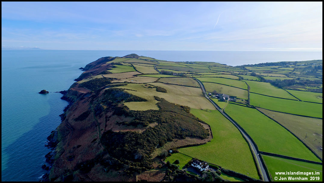 Looking east from Port e Vullen, over the Maughold Brooghs, with the low sun angle still casting shadows on the sea, despite the time being after 11 AM.
