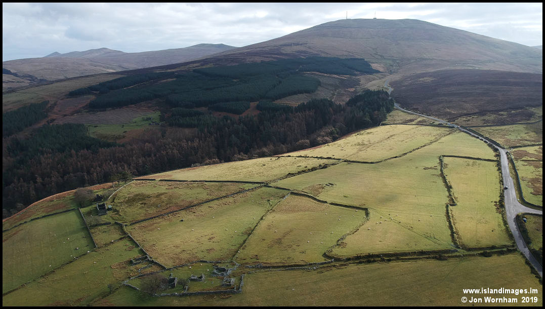 A burst of sinlight illuminates the old field patterns around The Corrody and The Creggans, with Snaefell and the North Barrule ridgeline in the distance.