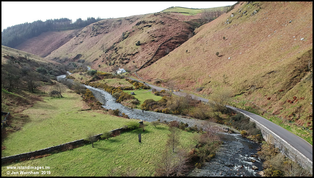 Looking back upstream past a standing stone, to Killabrega Cottage. The tholtan of Killabrega Farm is on the hill above the cottage and can be reached by a vey steep zig-zag path.
