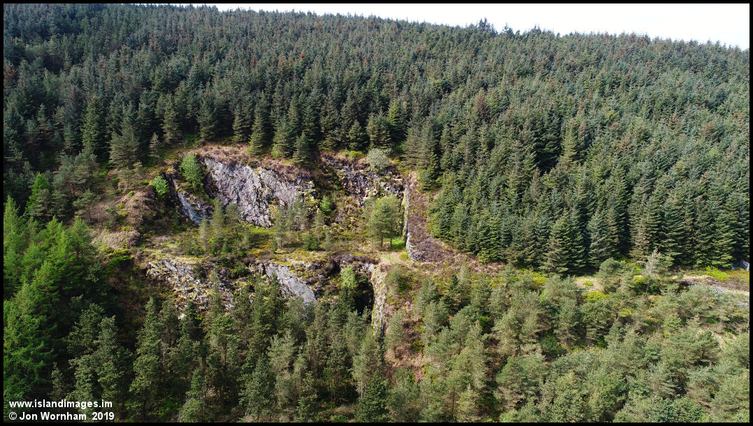Quarry working faces on two of the five levels worked visible in the plantation.