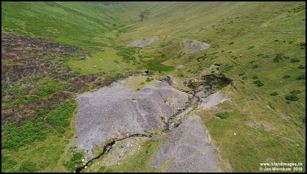 Spoil heaps on either side of the stream. The valley isn't named on modern maps, bu the 1870 Ordnance Survey map uses the name 'Ballakinnag' for the section lower down.