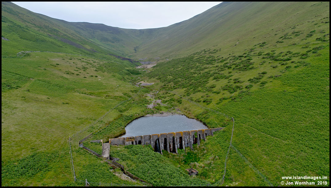 Looking over the litle reservoir and past the old mine workings to the head of the valley, lying between an unnamed (on the map) shoulder on the left and Slieau Freoagane on the right.
